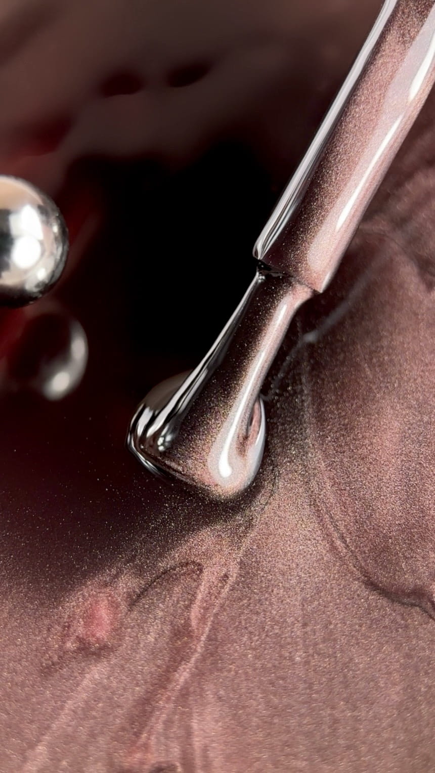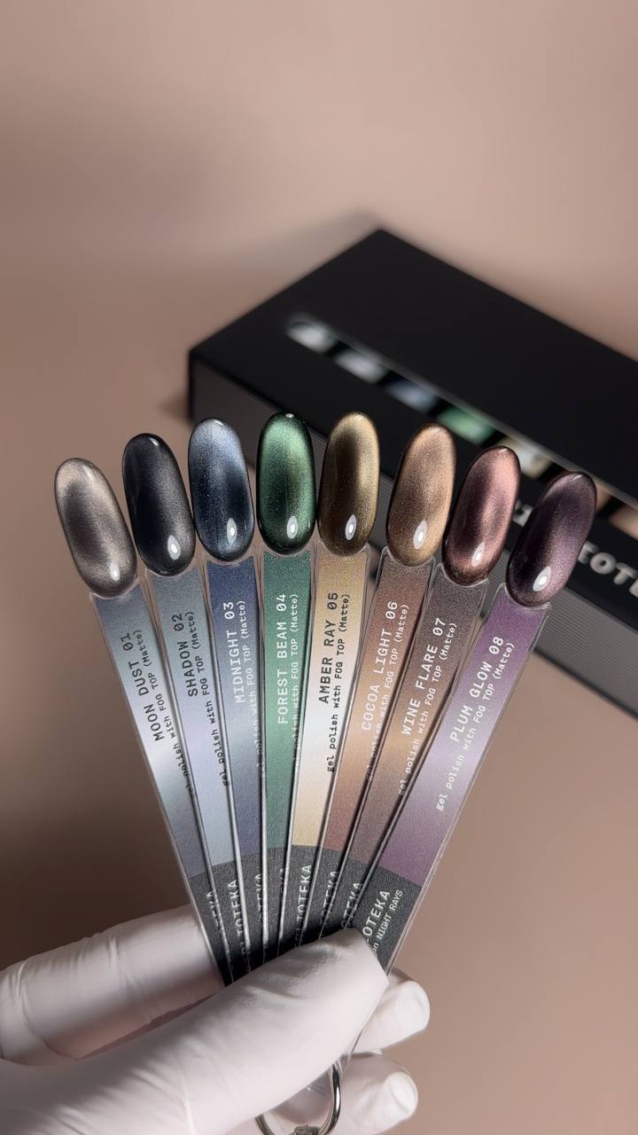 NIGHT RAYS – ciemna kolekcja odcieni magnetycznych, w której wiązka światła ujawnia się poprzez głębię koloru. W przeciwieństwie do RAYS, tutaj światło nie jest miękkie i rozproszone, lecz kontrastowe – wyłania się z ciemności, tworząc wyraźny kierunek i napięty ruch. Paleta oparta jest na nocnych barwach: chłodne srebrzyste, ciemnoszare, niebieskie, szmaragdowe, bursztynowe, brązowe oraz winno-śliwkowe. NIGHT RAYS – światło, które pojawia się tylko w głębi koloru. Odcienie kolekcji: 01 Moon Dust – chłodne srebrzyste światło 02 Shadow – głęboki ciemnoszary 03 Midnight – nocny niebieski 04 Forest Beam – szmaragd z refleksami 05 Amber Ray – ciepły bursztynowy 06 Cocoa Light – miękki ciepły brąz 07 Wine Flare – winny z efektem świetlnego rozbłysku 08 Plum Glow – śliwkowy blask Zalety: • Nasycone ciemne odcienie – zapewniają pełne krycie już od pierwszej warstwy. • Możliwość aplikacji bez podkładu – dla szybkiego i głębokiego efektu. • Różne techniki pracy – możliwość nakładania dwóch warstw dla zwiększenia intensywności koloru. • Praca na różnych bazach – aplikacja na czarną bazę dla maksymalnego kontrastu lub na bazę w kolorze „kociego oka” dla delikatniejszego efektu. • Kontrastowa wiązka światła – wyraźnie widoczna na ciemnej bazie. • Pigment magnetyczny – pozwala kontrolować kierunek i kształt światła. • Średnia konsystencja – stabilna i łatwa w kontroli podczas pracy. • Bezpieczna formuła – bez TPO. Parametry techniczne: • Typ: lakier hybrydowy magnetyczny (efekt „kociego oka”) • Konsystencja: średnia • Pigmentacja: średnia • Elastyczność: średnia • TPO FREE • Warstwa dyspersyjna: z warstwą lepką • Polimeryzacja: LED – 60 s / UV – 120 s • Pojemność: 10 ml × 8 Sposób użycia: 1. Przed użyciem dokładnie wymieszać produkt, aby równomiernie rozprowadzić pigment magnetyczny. 2. Nałożyć cienką lub średnią warstwę na przygotowaną bazę. 3. Przed utwardzeniem uformować efekt światła za pomocą magnesu. 4. Utwardzać: LED – 60 sekund / UV – 120 sekund. 5. Zabezpieczyć topem CLEAR no uv lub dla efektu matowego użyć FOG top. Środki ostrożności: Unikać kontaktu ze skórą. Przechowywać w szczelnie zamkniętym opakowaniu w temperaturze od +5°C do +25°C. Trzymać z dala od dzieci i bezpośrednich źródeł światła. Produkt jest wrażliwy na promieniowanie UV/LED – podczas pracy lub tworzenia treści nie pozostawiać otwartego pod lampą lub na słońcu, aby uniknąć przedwczesnej polimeryzacji. Stosować wyłącznie zgodnie z instrukcją.