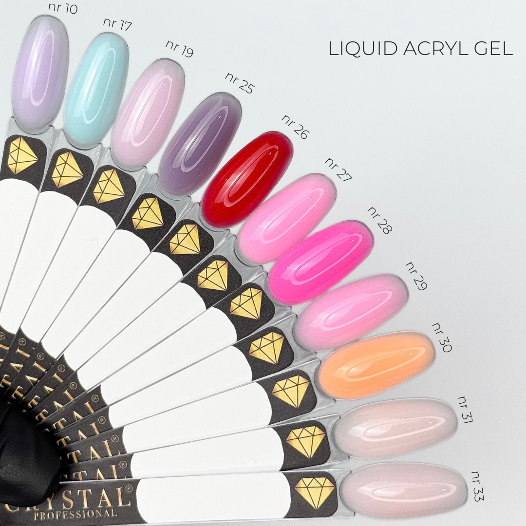Liquid Acryl Gel Crystal Professional - Płynny żel akrylowy może być stosowany do wszystkich typów paznokci. Nadaje manicure jeszcze większą wytrzymałość i długą trwałość. Ze względu na swoją konsystencję (podobną do gęstej bazy) materiał jest łatwy w aplikacji i rozprowadzaniu. Cechy:
