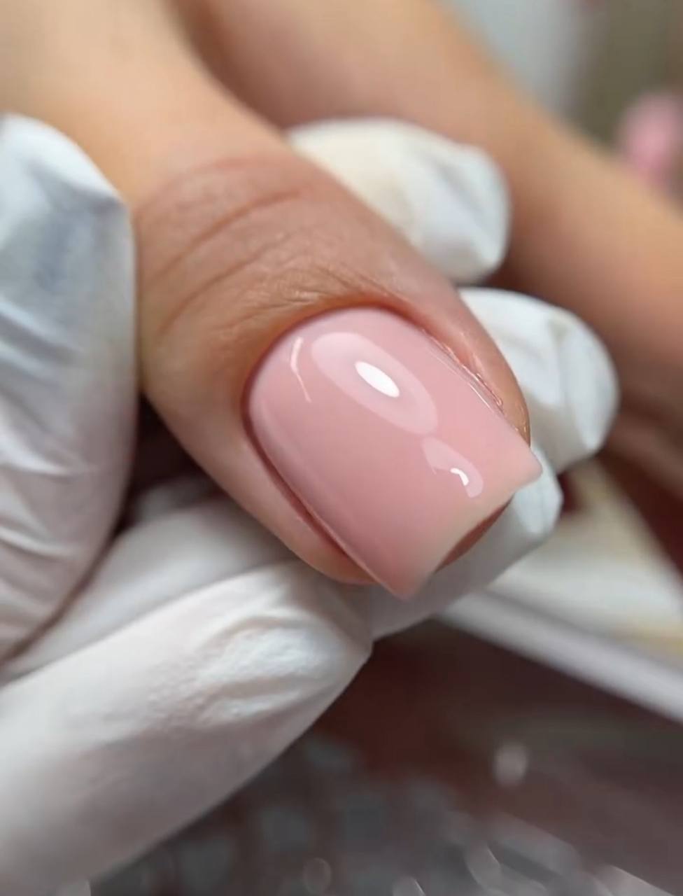 Przy wzmocnieniu koniecznie spiłuj swój naturalny paznokieć minimum o 1 mm od spodu, aby uniknąć zapowietrzeń od wolnego brzegu. Jeśli długość jest minimalna – zaleca się zabezpieczenie wolnego brzegu paznokcia topem od spodu.