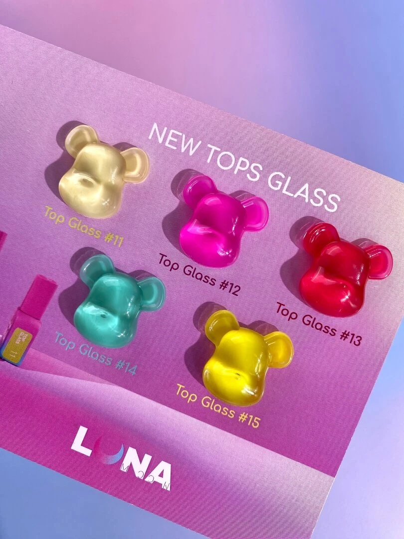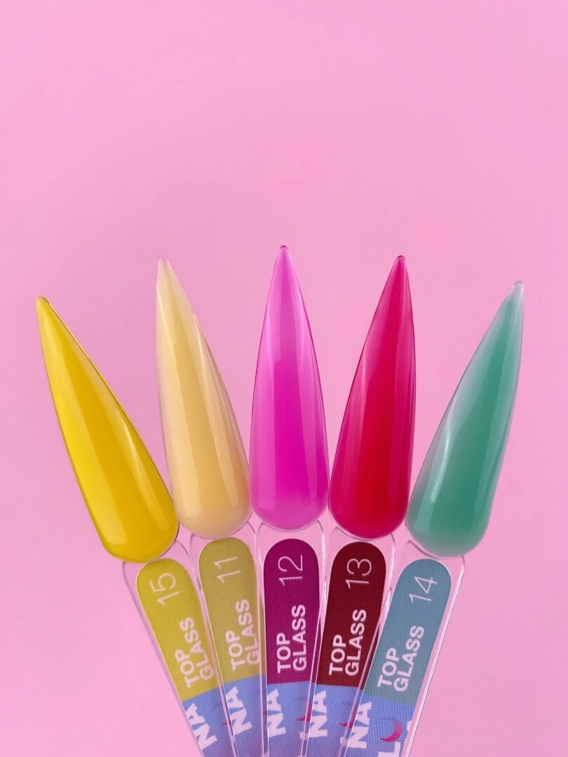 TOP GLASS – kolorowe topy bez warstwy dyspersyjnej, które utrzymują połysk nawet do 4 tygodni. Można je stosować w połączeniu z innymi produktami do tworzenia ciekawych zdobień, a dzięki kolorowym odcieniom – również jako samodzielne, modne wykończenie manicure.