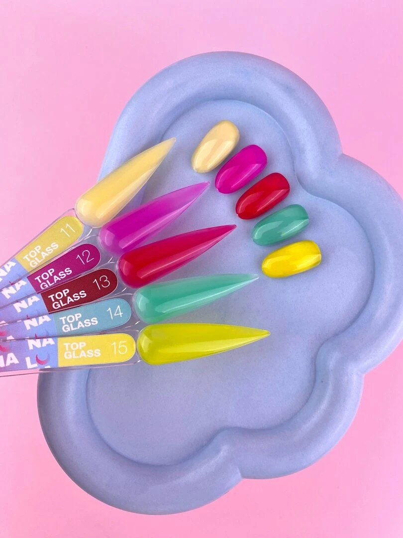 TOP GLASS – kolorowe topy bez warstwy dyspersyjnej, które utrzymują połysk nawet do 4 tygodni. Można je stosować w połączeniu z innymi produktami do tworzenia ciekawych zdobień, a dzięki kolorowym odcieniom – również jako samodzielne, modne wykończenie manicure.