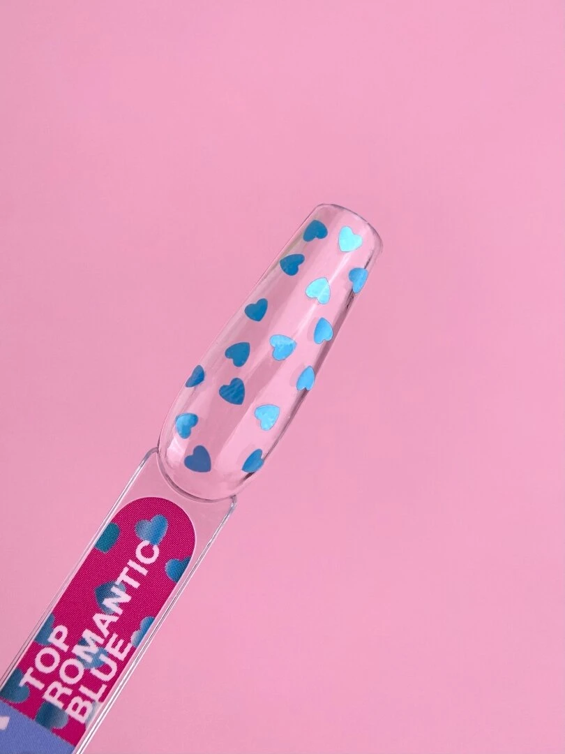 Top Romantic Blue – to top z błękitnymi serduszkami, bez warstwy dyspersyjnej, który będzie harmonijnie wyglądał z każdym kolorem na paznokciach. Sprawi, że Twój manicure stanie się ciekawy i niepowtarzalny.