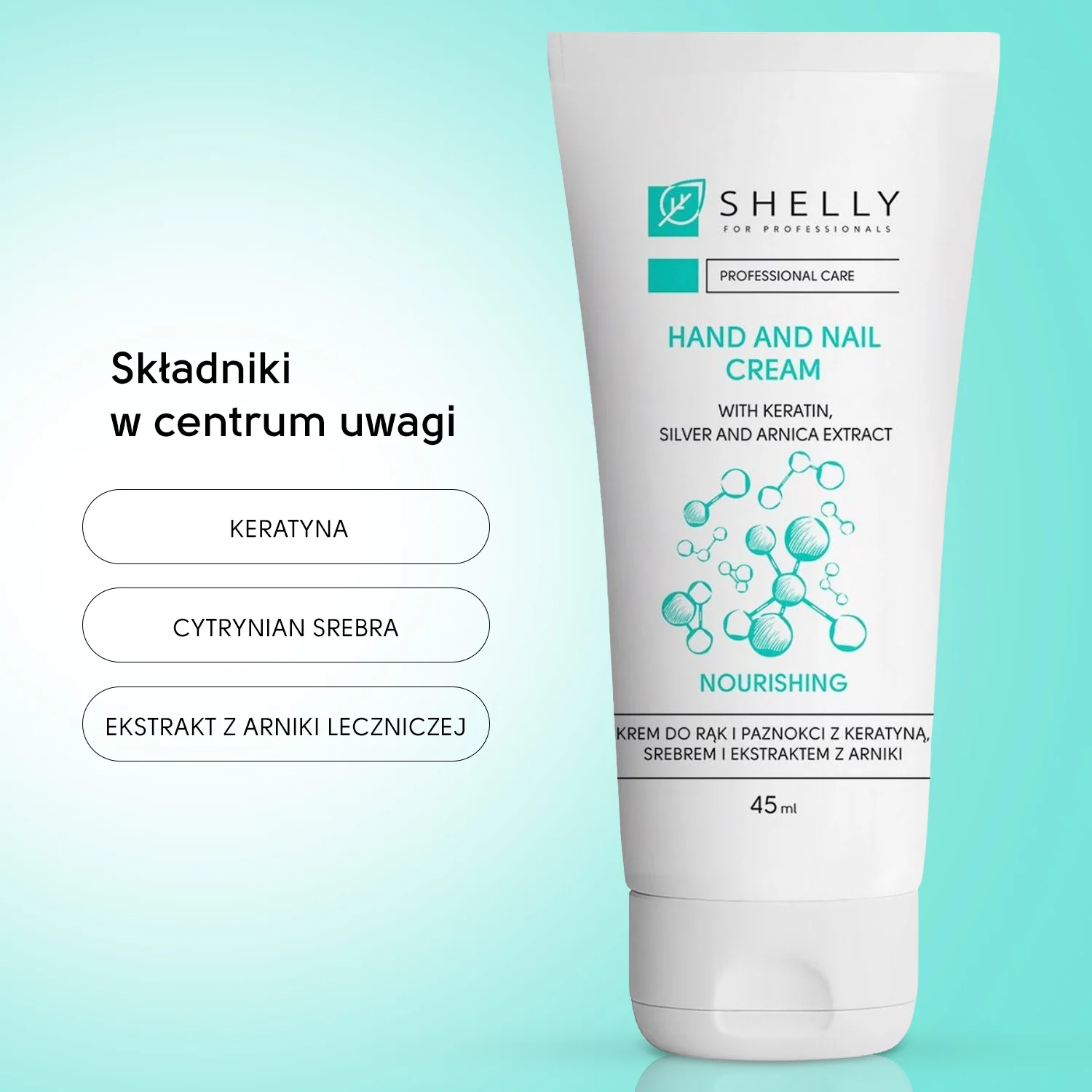Shelly Hand & Nail Cream z ekstraktem z keratyny, srebra i arniki zapewnia 24-godzinne nawilżenie i odżywienie dłoni, paznokci i skórek. Delikatna formuła, wzbogacona o silną mieszankę składników aktywnych, gwarantuje długotrwałą pielęgnację i ochronę.