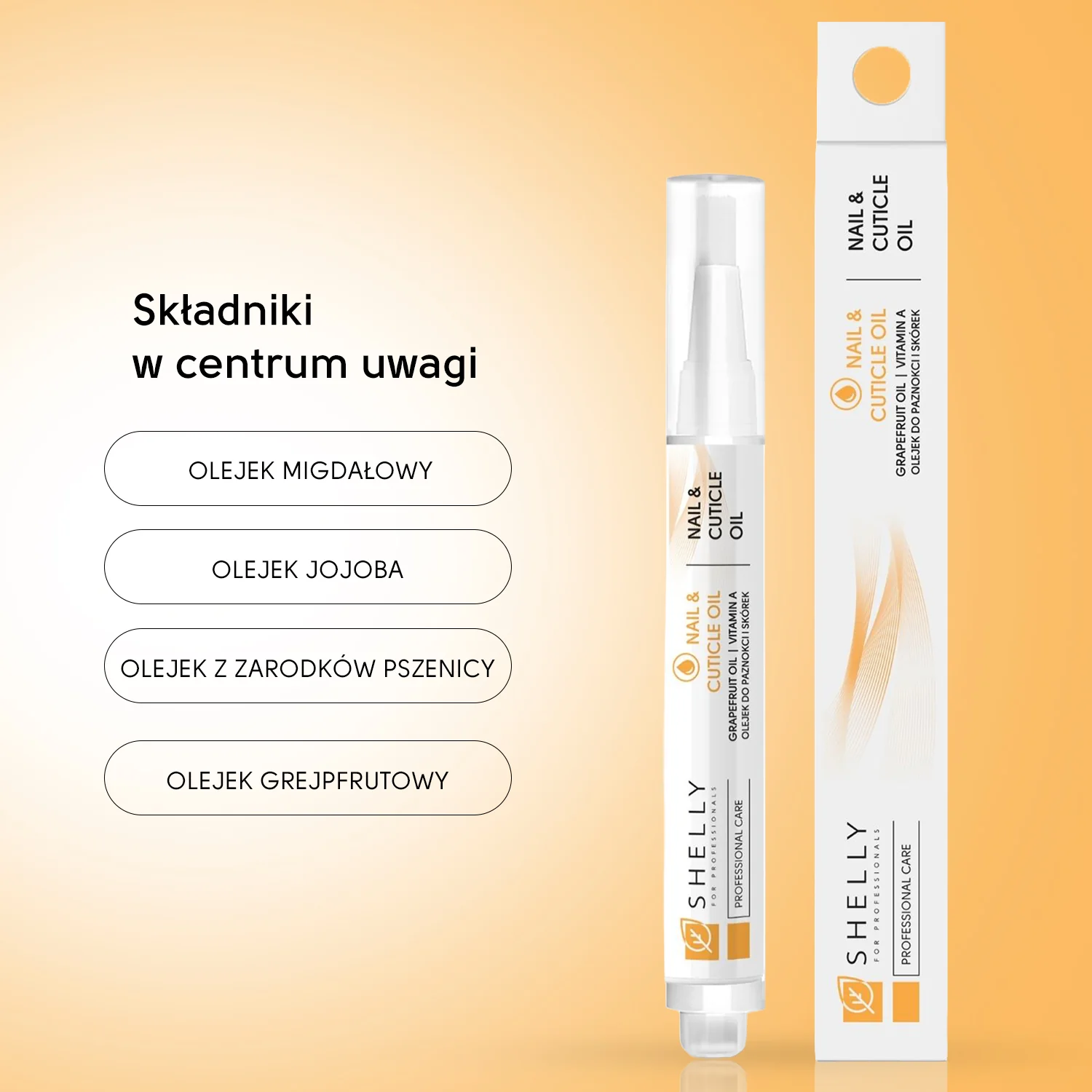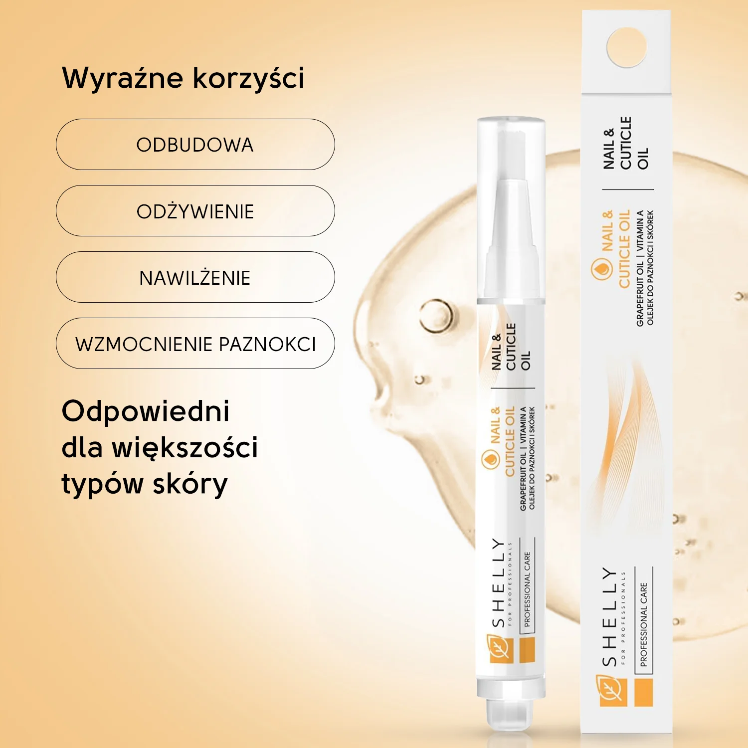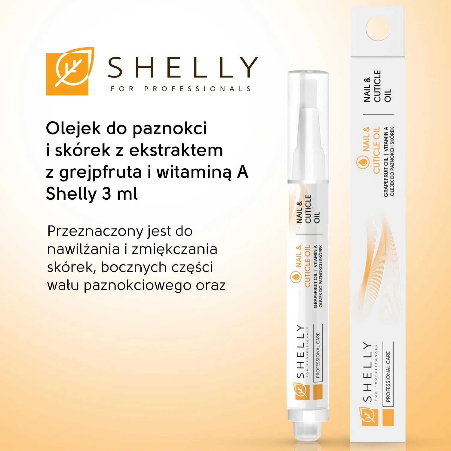 Shelly Nail & Cuticle Oil z ekstraktem z grejpfruta i witaminą A to niezbędny produkt zarówno dla profesjonalnych techników paznokci, jak i entuzjastów pielęgnacji domowej. Lekka, olejowa konsystencja i orzeźwiający cytrusowy zapach zapewniają luksusowe doznania.