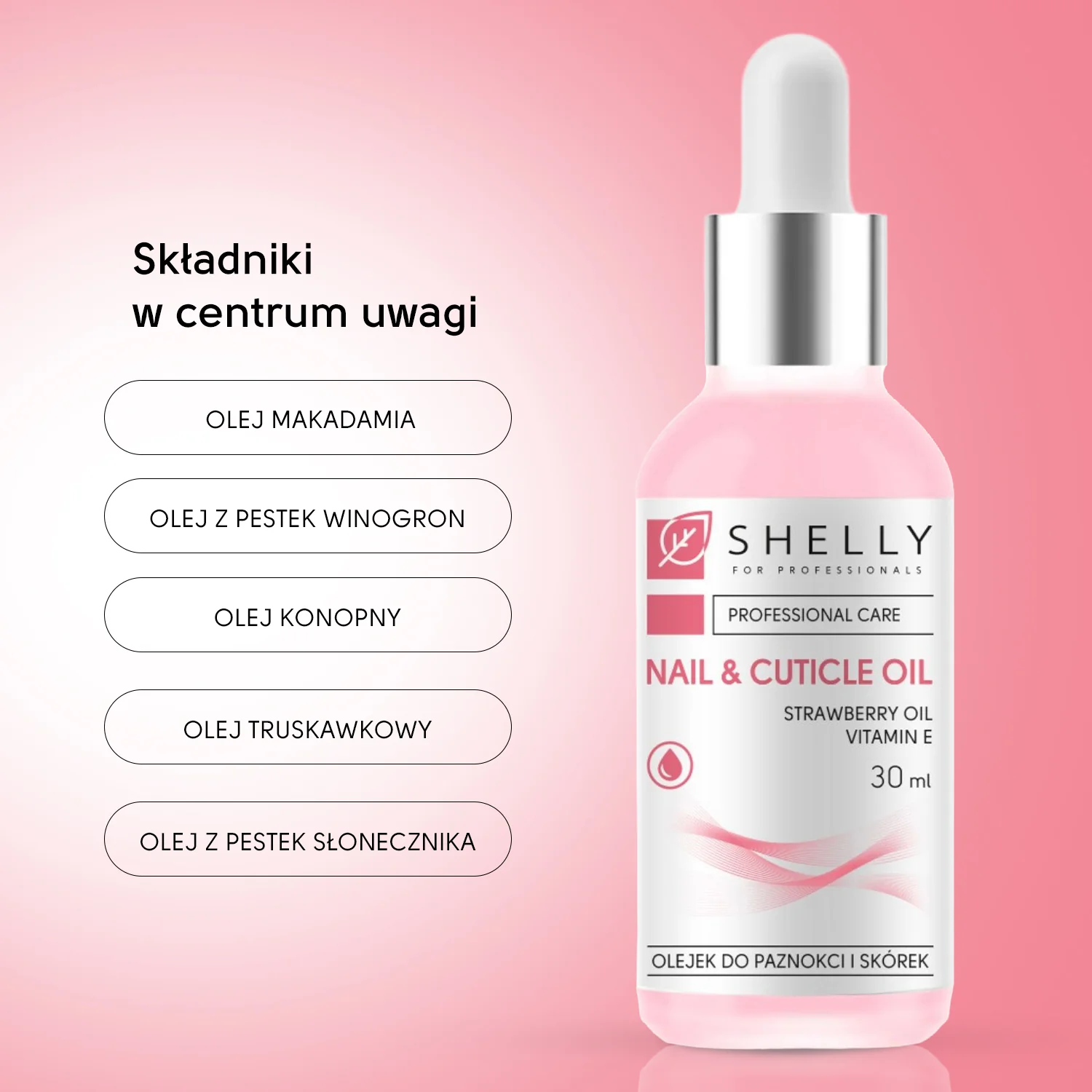 Został opracowany na bazie silnej mieszanki olejów: makadamia, pestek winogron, konopi i słonecznika. Składniki te zmiękczają, odżywiają i wzmacniają paznokcie. Dodatek ekstraktu z truskawek wykazuje właściwości antybakteryjne, regeneruje suchą i odwodnioną skórę oraz przywraca jej zdrowy wygląd, dostarczając witamin i nawilżenia.