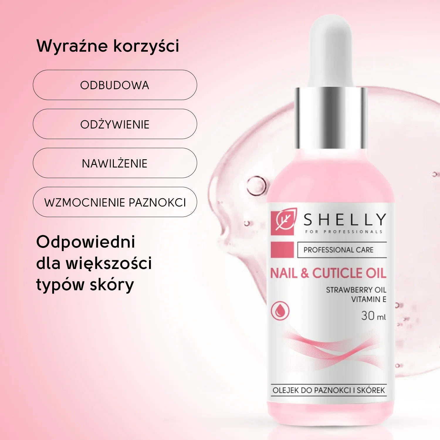 Olejek do paznokci i skórek Shelly Strawberry Extract & Vitamin E (30 ml) pomaga utrzymać zadbane skórki i paznokcie, podkreślając estetykę manicure.