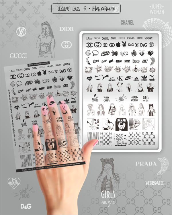 W zestawie z płytką znajduje się LISTA DEMO - przezroczysty szablon do przymierzania gotowych wzorów na paznokciach klientki!Lakier można łatwo oczyścić z arkusza demonstracyjnego za pomocą acetonu.